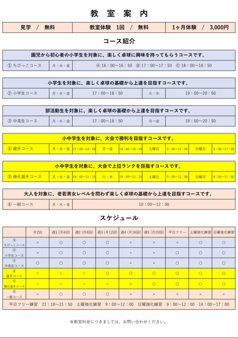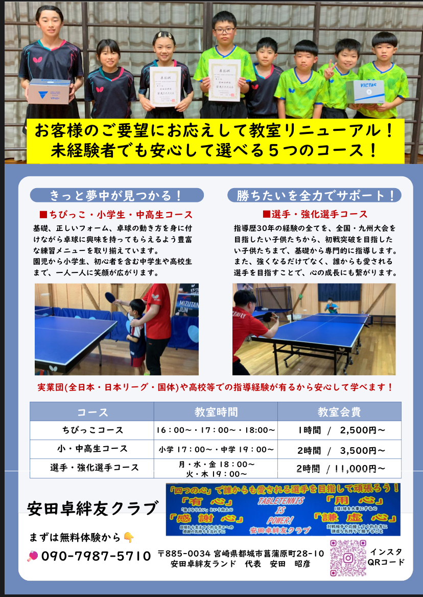 卓球を始めたいけど上手くできるか少し不安な方、部活動で活躍したい方、更には全国・九州大会出場を目指したい方まで、様々な思いや悩みを抱えている方のご要望にしっかりとサポートできる内容となっています👍